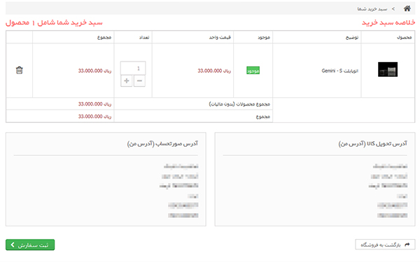 در این مرحله محصولاتی که شما برای خرید انتخاب کردید را به همراه خلاصه فاکتور، قیمت و تعداد هر محصول را به شما نشان می دهد. همچنین در این مرحله شما می توانید تعداد هریک از محصولات انتخابی را کم، زیاد و حتی حذف کنید. سپس بر روی لینک "ثبت سفارش" کلیک کنید.
